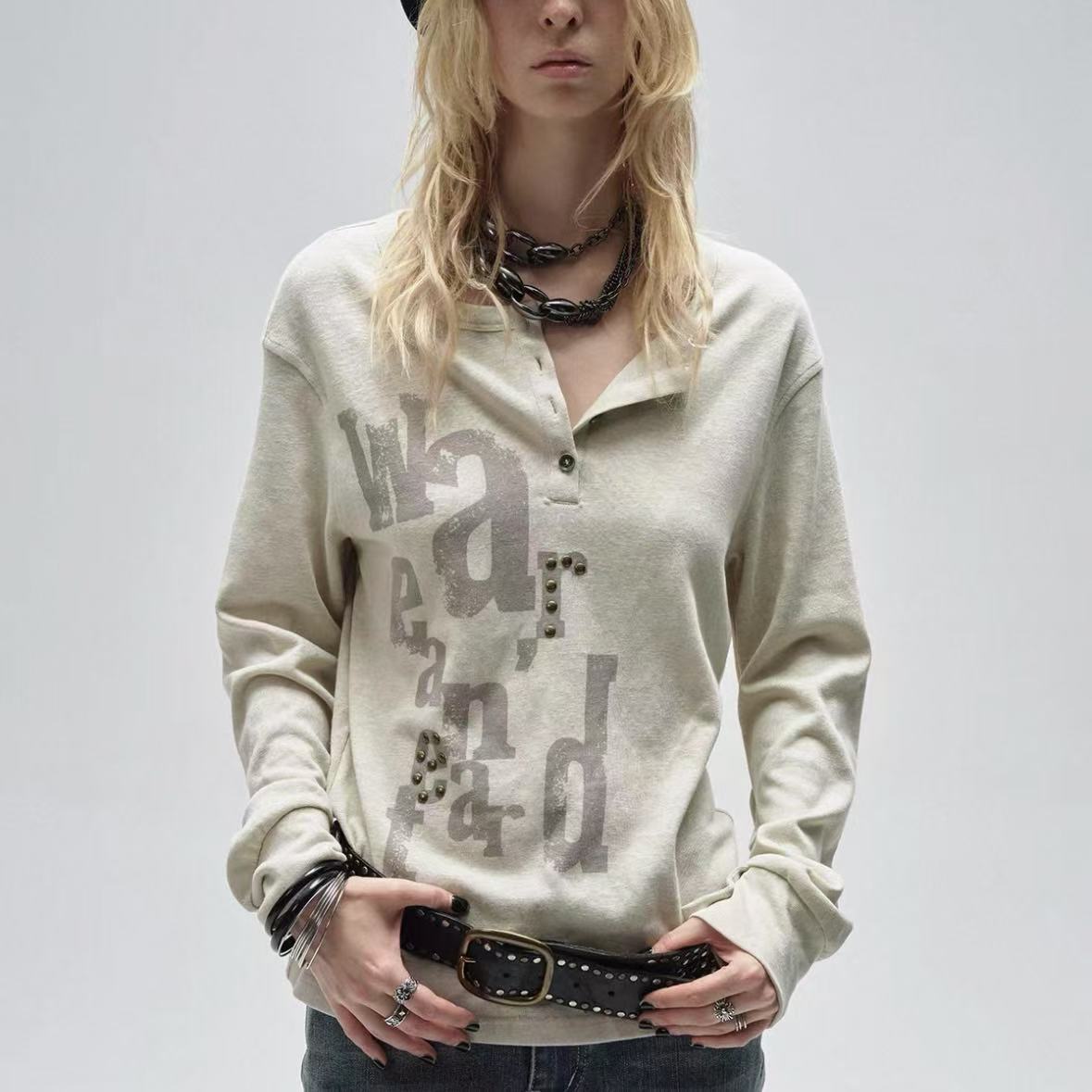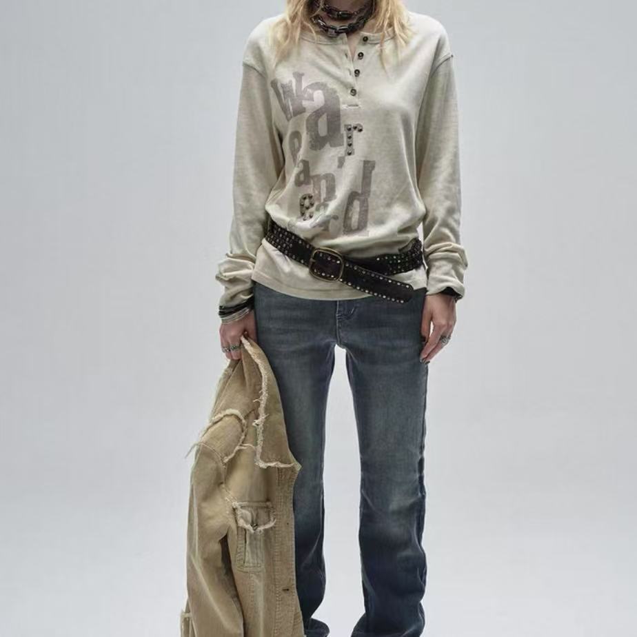 Vintage Two-Tone Half Placket Tee – Punk Texture Sleeve with Stacked Cuff & Crystal Heat Transfer