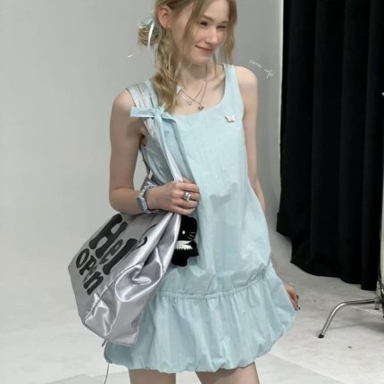 2025 Summer American Style Tie-Waist Dress – Petite Fit Blue-Green Bloom Hem Camisole Dress