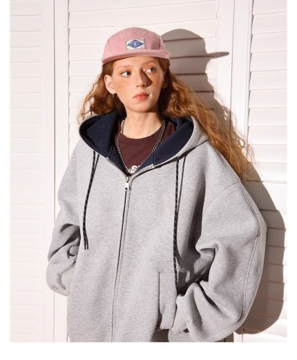 American Color-Block Hooded Cardigan – Women’s Oversized Loungewear Zip-Up