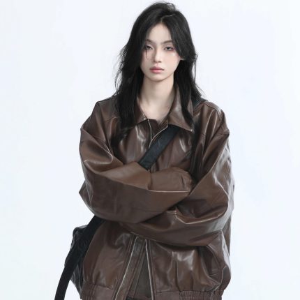 2025 Maillard Brown Vegan Leather Jacket – Women’s Retro American Biker Style